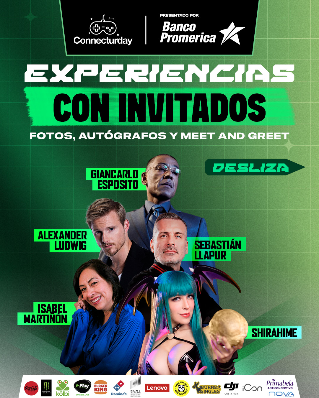 Asimismo, los asistentes podrán disfrutar de experiencias exclusivas con los invitados internacionales, que incluyen sesiones de fotos, firma de autógrafos y encuentros con figuras como Giancarlo Esposito, Alexander Ludwig, Sebastián Llapur, Isabel Martiñón y Shirahime.